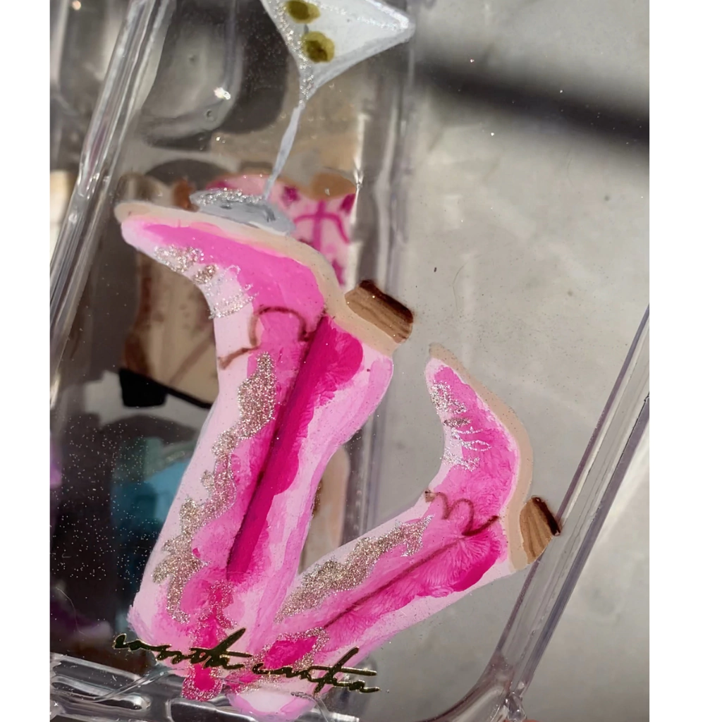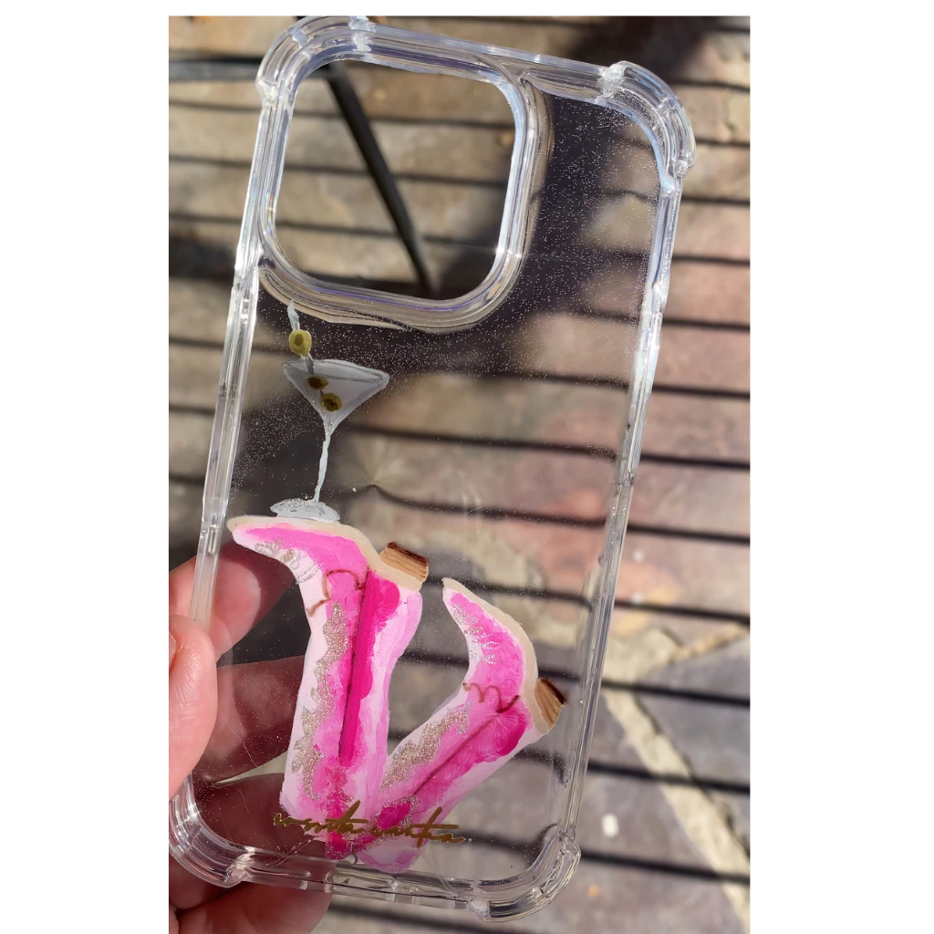 Este case está pintado a mano con botas vaqueras de color rosa sosteniendo un martini, utilizando los mismos colores y materiales. El acomodo y acabado pueden variar ligeramente, ya que cada pieza se elabora de forma artesanal, haciendo que cada case sea único e irrepetible.